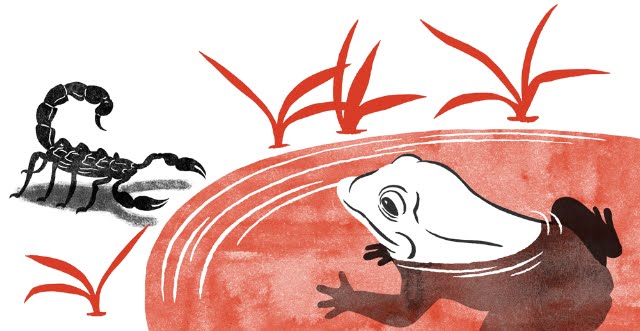 "O escorpião queria atravessar um rio, mas não sabia nadar. Pediu então ao sapo que o levasse em suas costas até a outra margem. O sapo respondeu assustado: - Não escorpião! Todo mundo sabe que você tem esse veneno horrível no seu ferrão. Como vou saber que você não vai me matar? O escorpião então respondeu: - É claro que não vou lhe matar! Raciocine comigo! Se eu matar você, vamos morrer os dois, pois eu não sei nadar... Assim, o sapo pensou e aceitou levar o escorpião em suas costas. Quando estavam no meio da travessia, o escorpião ferroou o sapo com seu forte veneno. O sapo assustado olhou para o escorpião e perguntou: - Por que você fez isso? Agora vamos morrer os dois! O escorpião também assustado gritou: - É a minha natureza! Não tive como evitar!"